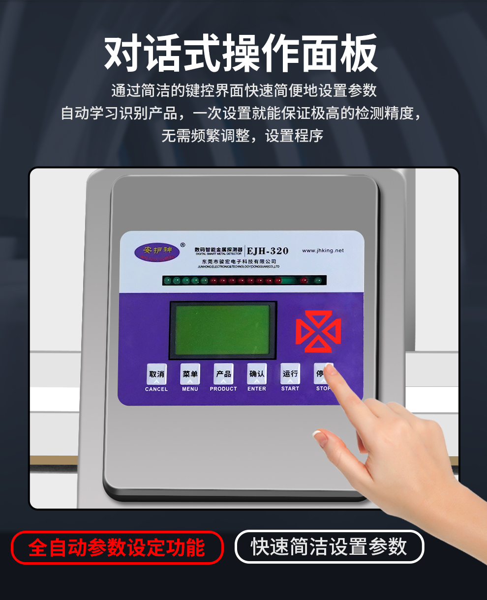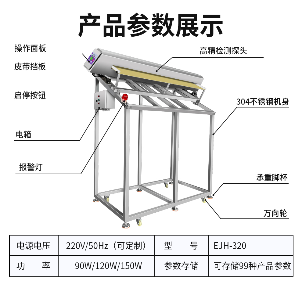 EJH-320系列全金屬檢測儀,可根據生產線需求配套定制窗口尺寸,檢測精度最大化,先進數字信號處理技術,有效克服產品效應,可精準檢測鐵、不銹鋼、銅、鋁等金屬,靈敏度高達0.5mm,廣泛應用在檢測肉類、水產、果蔬等食品加工過程中混入的金屬碎片、鐵絲等,精準高效,為您徹底解決金屬異物隱患。
