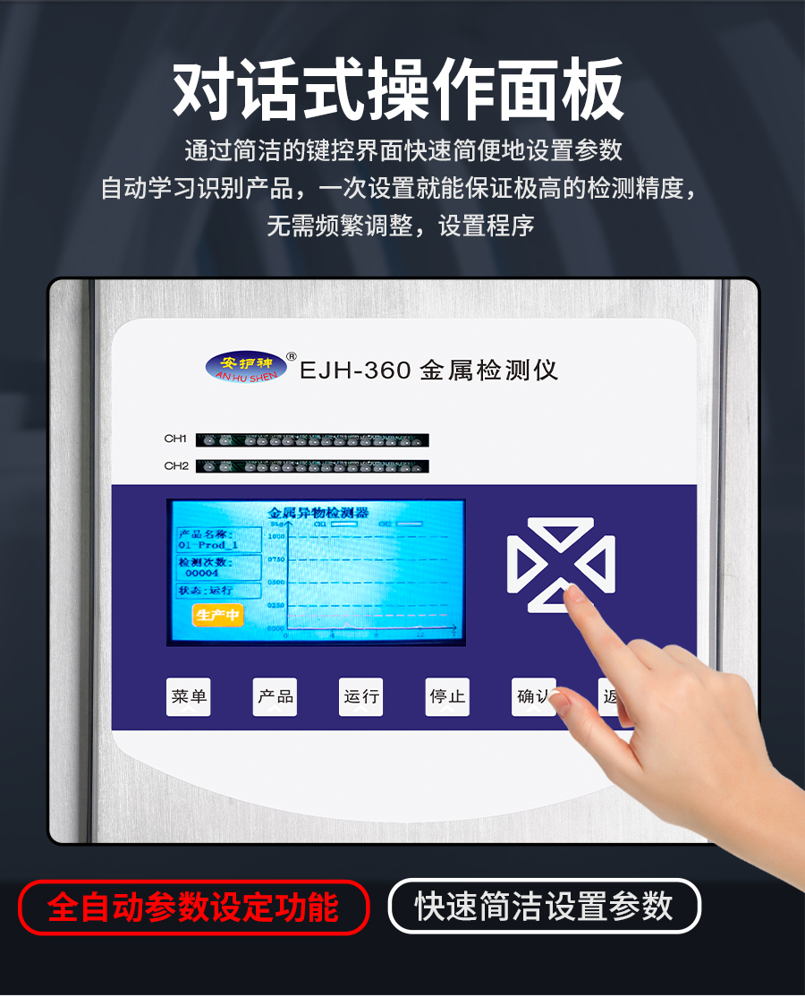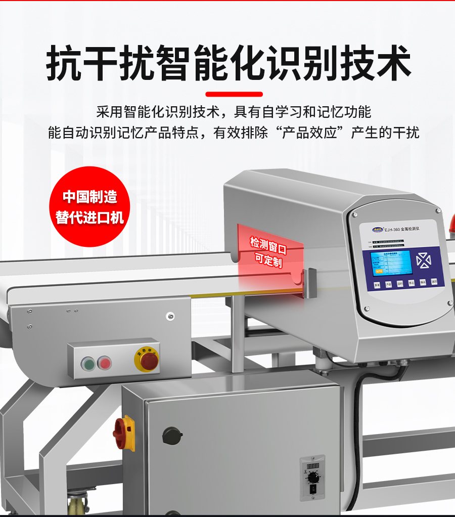 安護神EJH-360金屬檢測機采用先進的雙信號(磁感+電導)或多頻技術,精準檢測鐵、非鐵(如銅、鋁、不銹鋼)等各類金屬異物,靈敏度可達Fe 0.3mm, SUS 0.5mm (具體數值根據產品實際性能填寫),有效杜絕漏檢。獨特算法和屏蔽設計,有效抵抗產品效應(濕、鹽、酸等)和環境干擾(振動、溫度波動),大幅降低誤報率,保障生產流暢性。配備氣動翻板、推桿、吹氣等多種快速響應剔除機構,確保檢測到的含金屬產品被有效隔離,不影響合格品通過。 適用于肉禽水產加工、烘焙與糖果、乳制品、休閑零食、調味品與醬料、速凍食品、寵物食品、包裝材料進料檢測等行業