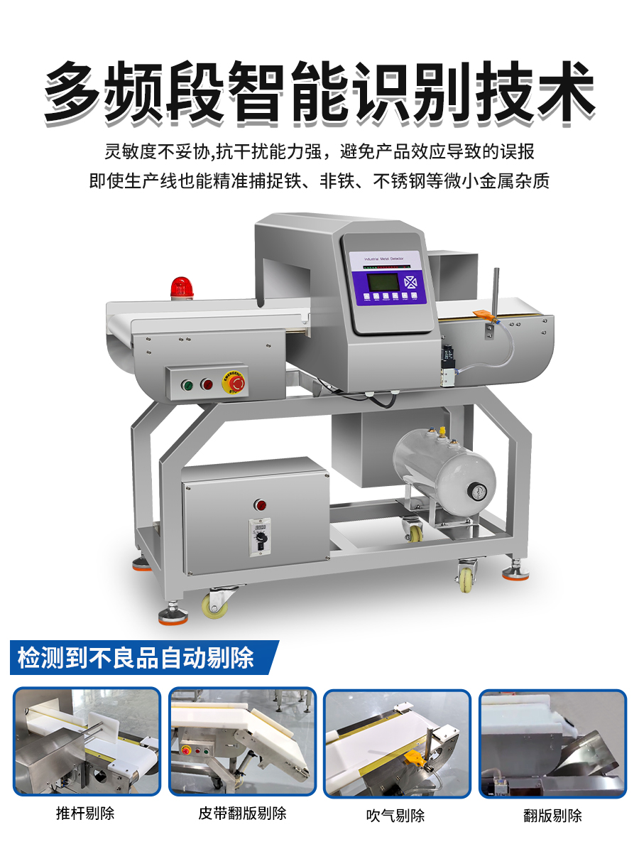 EJH-320系列全金屬檢測儀,可根據(jù)生產(chǎn)線需求配套定制窗口尺寸,檢測精度最大化,先進數(shù)字信號處理技術(shù),有效克服產(chǎn)品效應(yīng),可精準檢測鐵、不銹鋼、銅、鋁等金屬,靈敏度高達0.5mm,廣泛應(yīng)用在檢測肉類、水產(chǎn)、果蔬等食品加工過程中混入的金屬碎片、鐵絲等,精準高效,為您徹底解決金屬異物隱患。