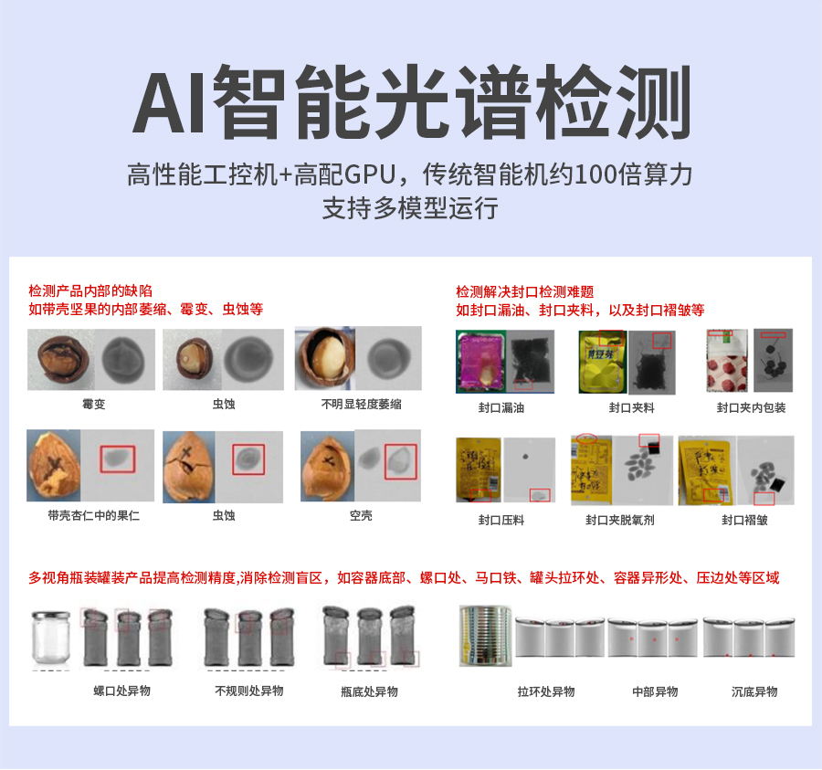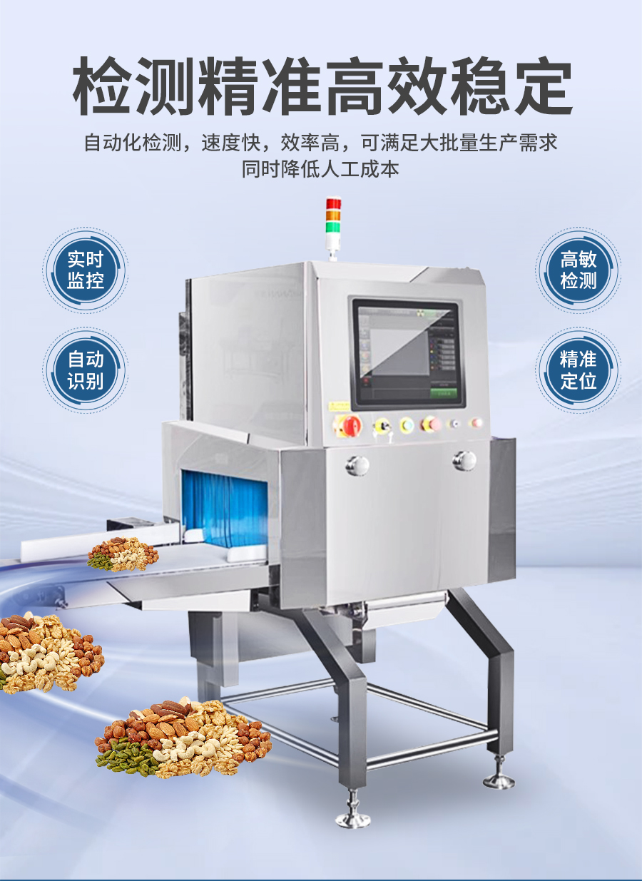 食品x光異物檢測機實現多點遺漏檢測,屏蔽分段檢測,液位高度檢測,高速剔除檢測,遠程遙控控制,綜合實時管理等功能。廣泛的應用于各種食品、藥品、飲料等產品中的異物檢測。