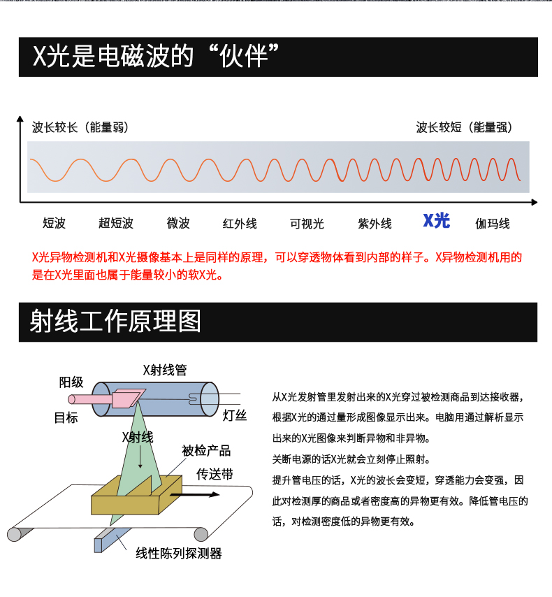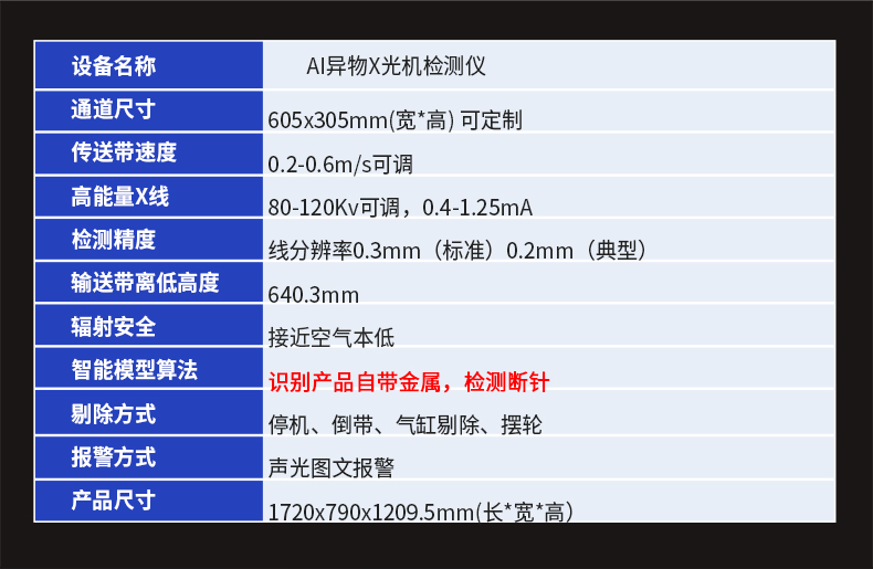 采用先進的AI智能算法頻技術,精準檢測斷針等金屬異物,靈敏度可達Fe 0.2mm,雙屏黑白高清成像,支持數據自動上傳服務器,檢測報表自動生成